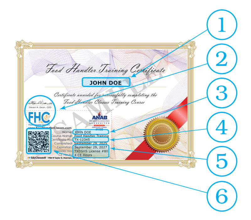 The following information shows where you will find certain information on your FHC food handler's certificate: